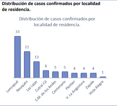 La concentración de los casos confirmados la tiene Loncopué con una cantidad de 33; luego está Neuquén con 21; Las Lajas -que reportó al primero en el interior- con 13. Cutral Co contabiliza 6; luego le siguen San Martín de los Andes y Centenario con 5 cada una. Mientras que 4 registran Plottier, Villa a Angostura y Zapala. Y uno tiene Vista Alegre.