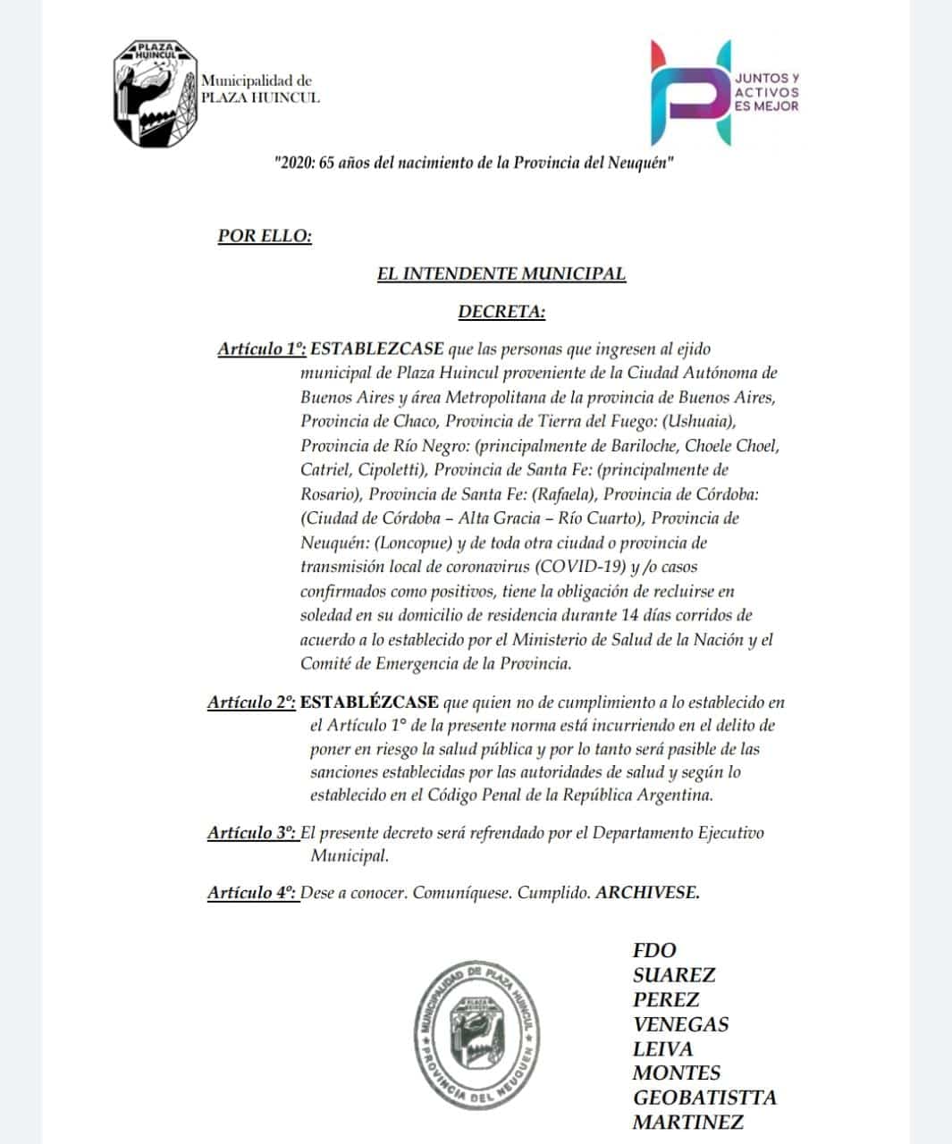 En cuanto a los que provengan de la provincia de Neuquén: de Loncopué; y de toda otra ciudad o provincia con transmisión local de coronavirus COVID-19 y o en casos confirmados como positivos, tienen la obligación de recluirse en soledad en su domicilio de residencia durante 14 días corridos.