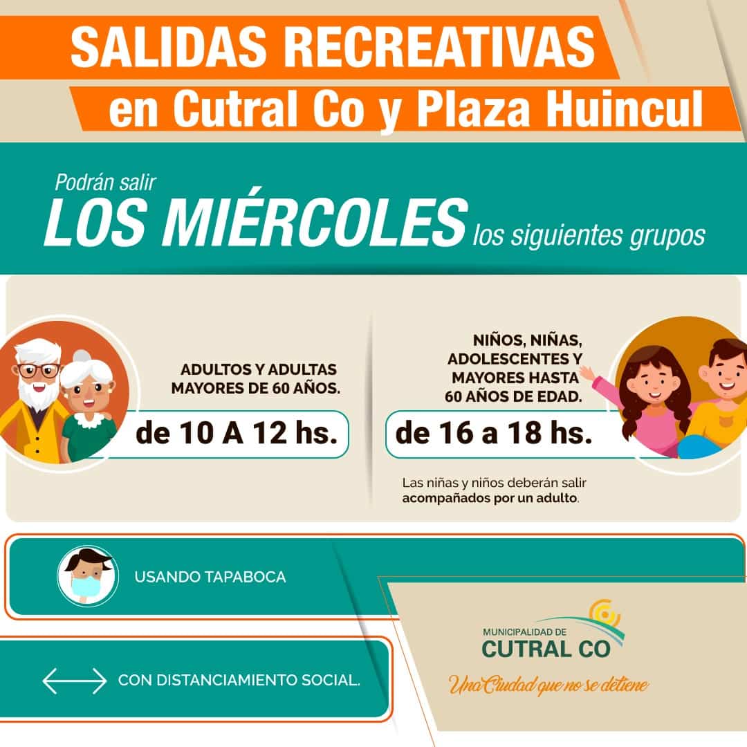 Se anunció esta tarde otro día de salidas recreativas en las dos ciudades: Cutral co y Plaza Huincul. Será los miércoles para adultos mayores; y niñas, niños y adolescentes. Pero en Cutral Co además se suma de grupo de mayores hasta 60 años.