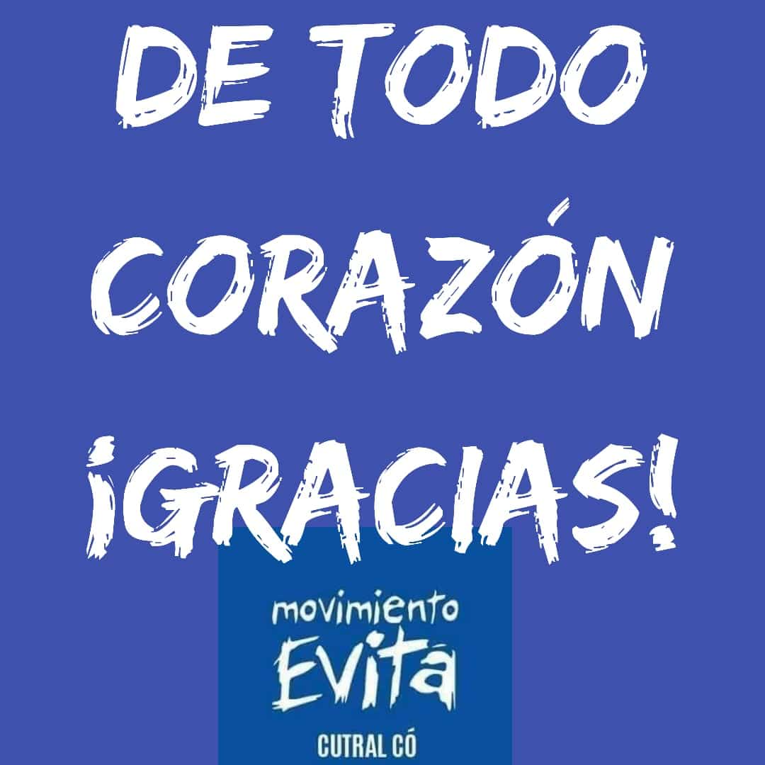 Mediante un comunicado, el Movimiento Evita agradeció el apoyo recibido por comercios y voluntarios para la campaña que se extendió por casi dos meses. Cada lunes, miércoles y viernes elaboraban las viandas para repartir a familias de las dos ciudades, con una cifra inicial de 90 porciones, y una final de 170. “Hoy decimos Objetivo Cumplido, estuvimos ahí ininterrumpidamente en el momento más difícil y eso nos pone felices porque nuestra organización lleva como lema ‘La patria es el otro’ y nuevamente lo dejamos en manifiesto” agregan.