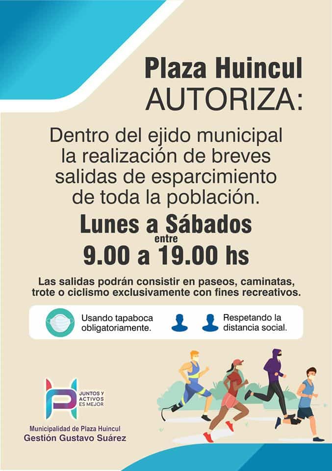 El municipio adhiere al decreto provincial que autoriza Running individual sin circuitos, ciclismo individual, paddle hasta dos jugadores, squash hasta dos jugadores, pelota paleta hasta dos jugadores, kitesurf, canotaje, hipismo, golf, tiro deportivo en circuitos habilitados, tiro con arco en circuitos habilitados. En los horarios de 8 a 20, viernes, sábado y domingo.