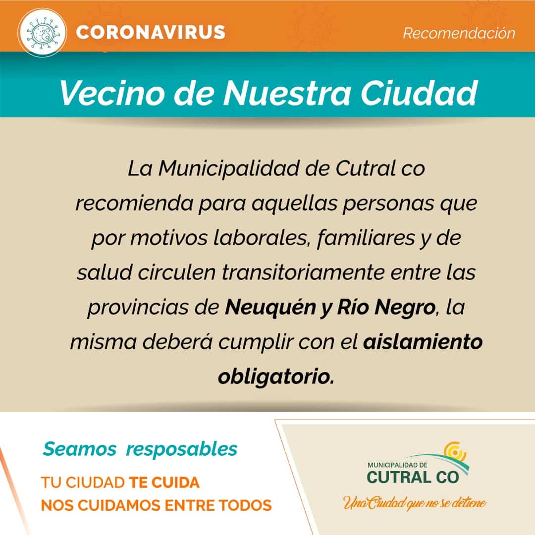 Además se recomienda que los vecinos y vecinas que viajen a Neuquen, hagan aislamiento por 14 días