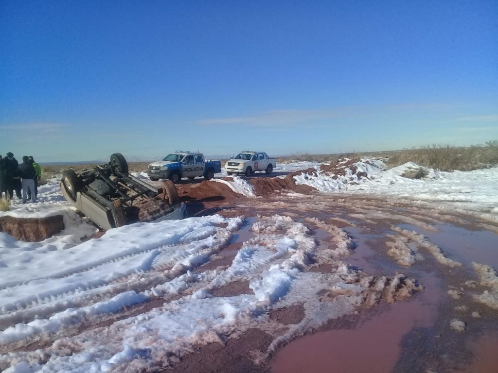 “El vehículo estaba invertido, sobre su techo y dos personas permanecían en las inmediaciones. Según refirieron iban en dirección norte y por las características del terreno hielo, nieve, y barro, se produjo el vuelco”, agregó.