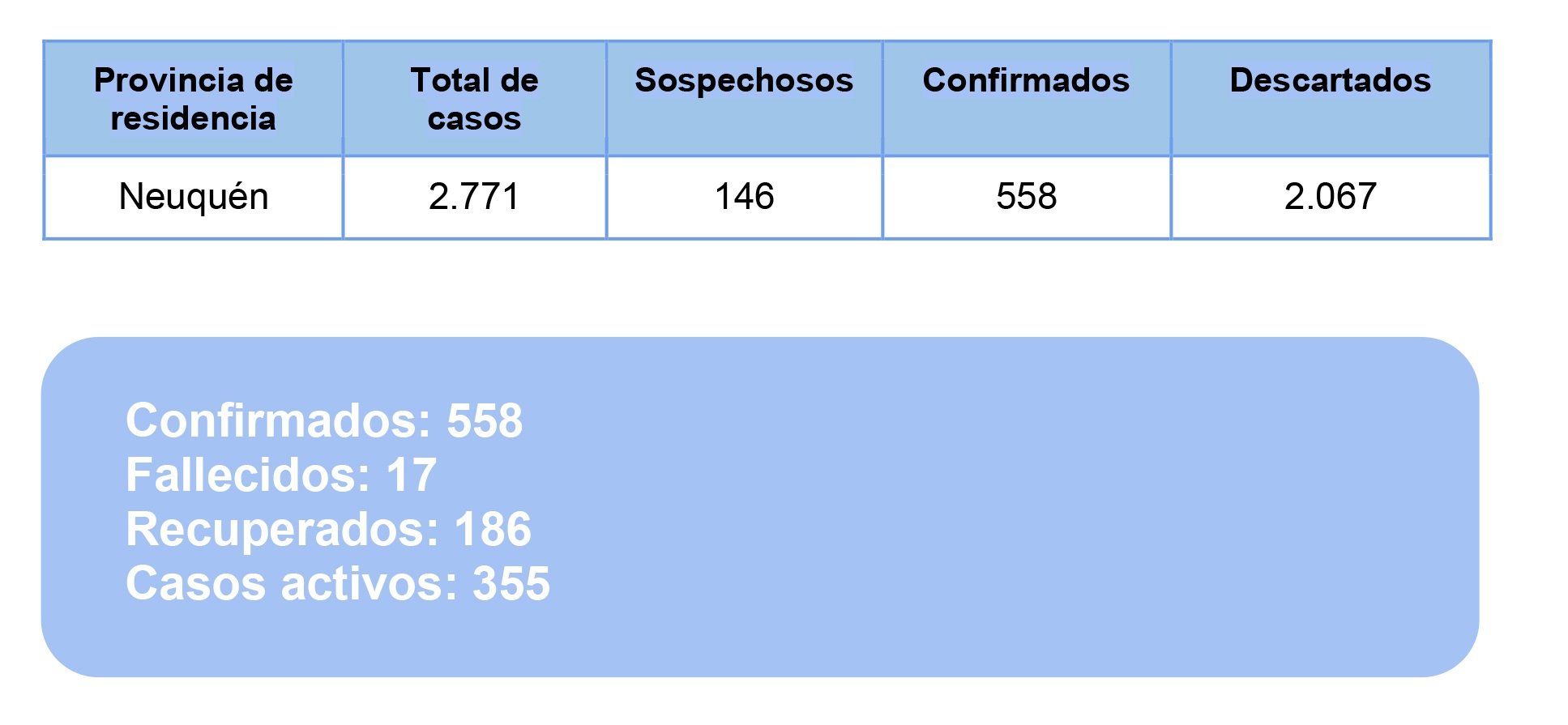 Además, se reportaron (17) nuevos casos sospechosos de Coronavirus (COVID-19) de la provincia del Neuquén.