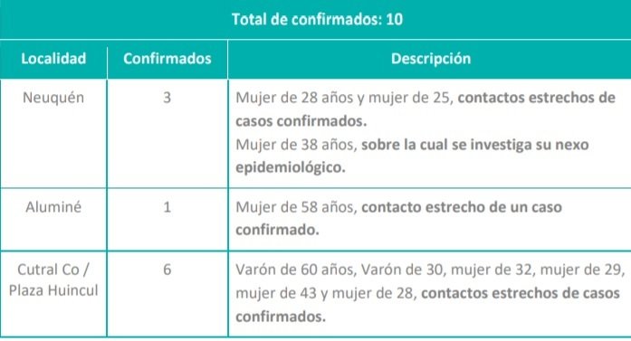 Al momento de este reporte, emitido este lunes por la noche se notificaron diez (10) nuevos casos confirmados de Coronavirus (COVID-19) de la provincia del Neuquén. De los diez, seis son de Cutral Co y Plaza Huincul