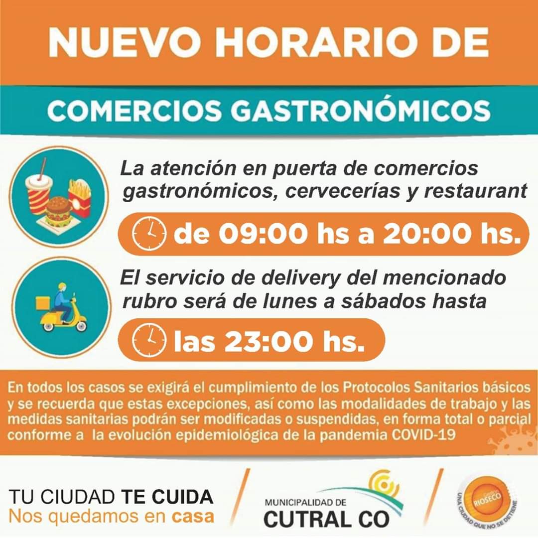 Desde la dirección de Comercio y Bromatología de Cutral Co se informó sobre la modificación del artículo 1° del decreto 15499/20 Y quedó redactado “establézcase la atención en puerta de comercios gastronómicos, cervecerías y restaurant, en el horario de 9 horas a 20:00 horas. El servicio de delivery del mencionado rubro será de lunes a sábado hasta las 23 horas. La modificación comienza a regir desde este lunes 13.