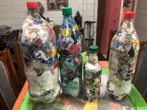 El ecoladrillo se crea con botellas plásticas de menos de 3 litros, rellenadas con cualquier tipo de residuos plásticos, papel aluminio, colilla de cigarrillos y otros. Una vez terminado y compactado, puede servir como aislante acústico, térmico y antisísmico.