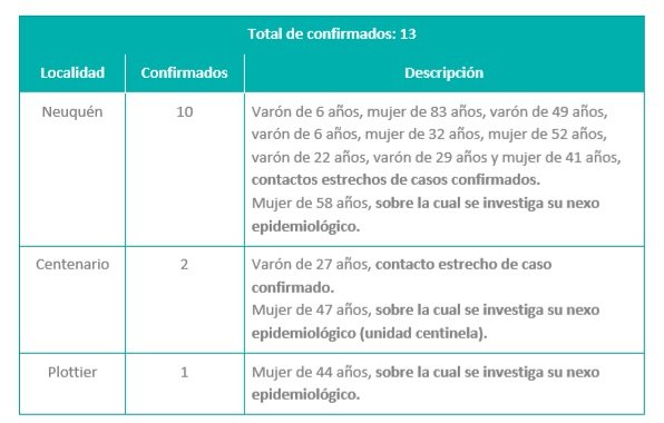 El primer parte del Comité Provincial de Emergencia da cuenta de 13 nuevos casos confirmados de coronavirus (Covid-19) de la provincia del Neuquén.
