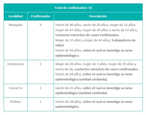 Al momento de este reporte, se notificaron 16 nuevos casos confirmados de coronavirus (Covid-19) de la provincia del Neuquén. Uno de ellos de Cutral Co