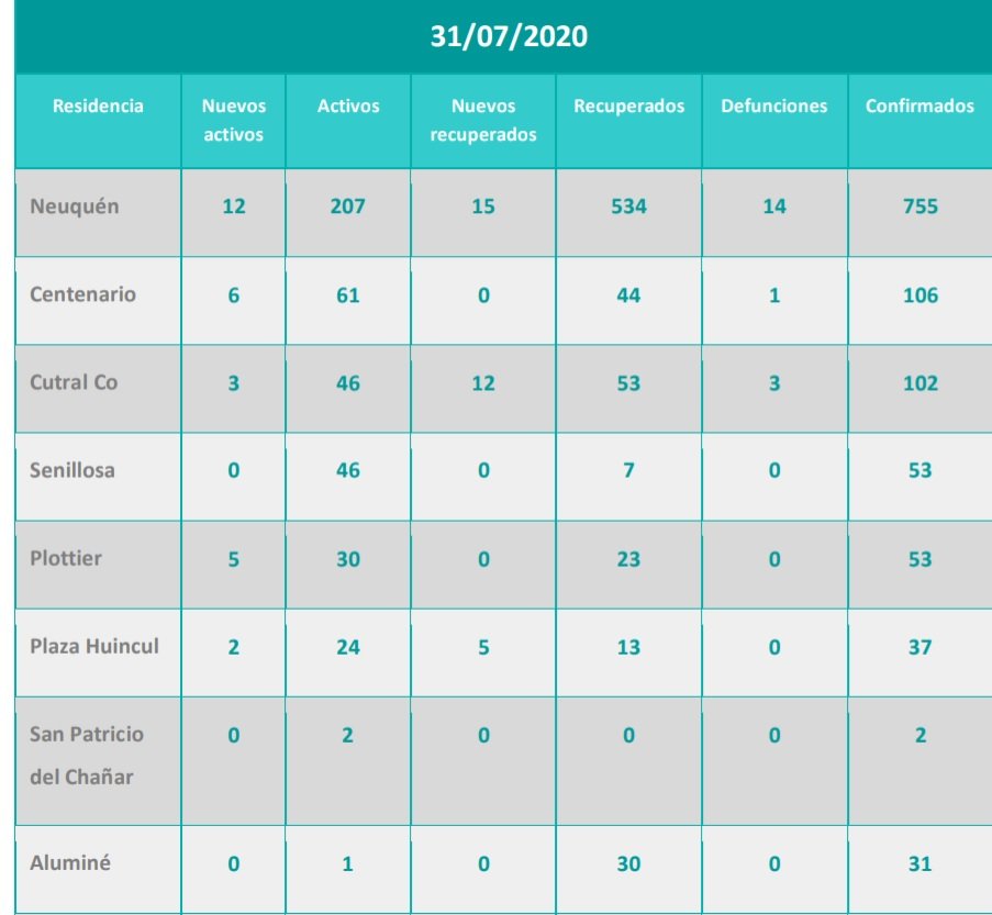 Al momento de este reporte, se notificaron doce (12) nuevos casos confirmados de Coronavirus (COVID-19) de la provincia del Neuquén. Cuatro corresponden a vecinos de la comarca petrolera.