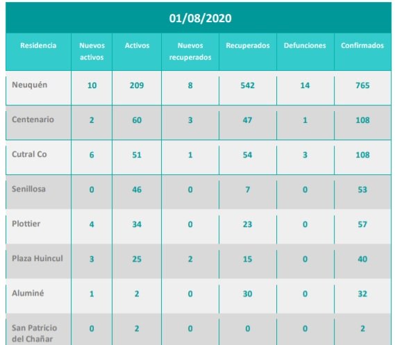 Además, se reportaron quince (15) nuevos casos recuperados de Coronavirus (COVID-19) de la provincia del Neuquén: 8 personas de Neuquén capital, 3 personas de Centenario, 2 personas de Plaza Huincul, 1 persona de Rincón de los Sauces y 1 persona de Cutral Co. Se trata de 8 varones y 7 mujeres, cuyas edades oscilan entre los 7 y 68 años.