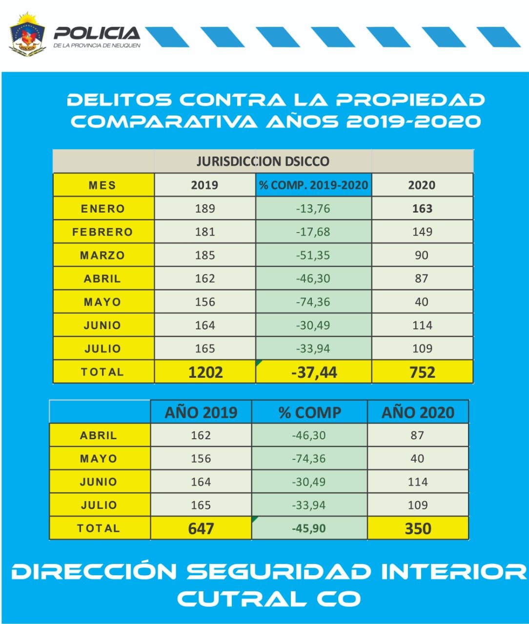 Al cierre del primer trimestre del 2020, la nueva conducción de la división Seguridad Interior de Cutral Co presentó una comparativa del índice de delitos contra la propiedad que daba un descenso del 13,75% respecto al 2019. Pero la baja se profundizó aun más desde marzo, con el inicio de las medidas de restricción de circulación por el aislamiento social preventivo y obligatorio.