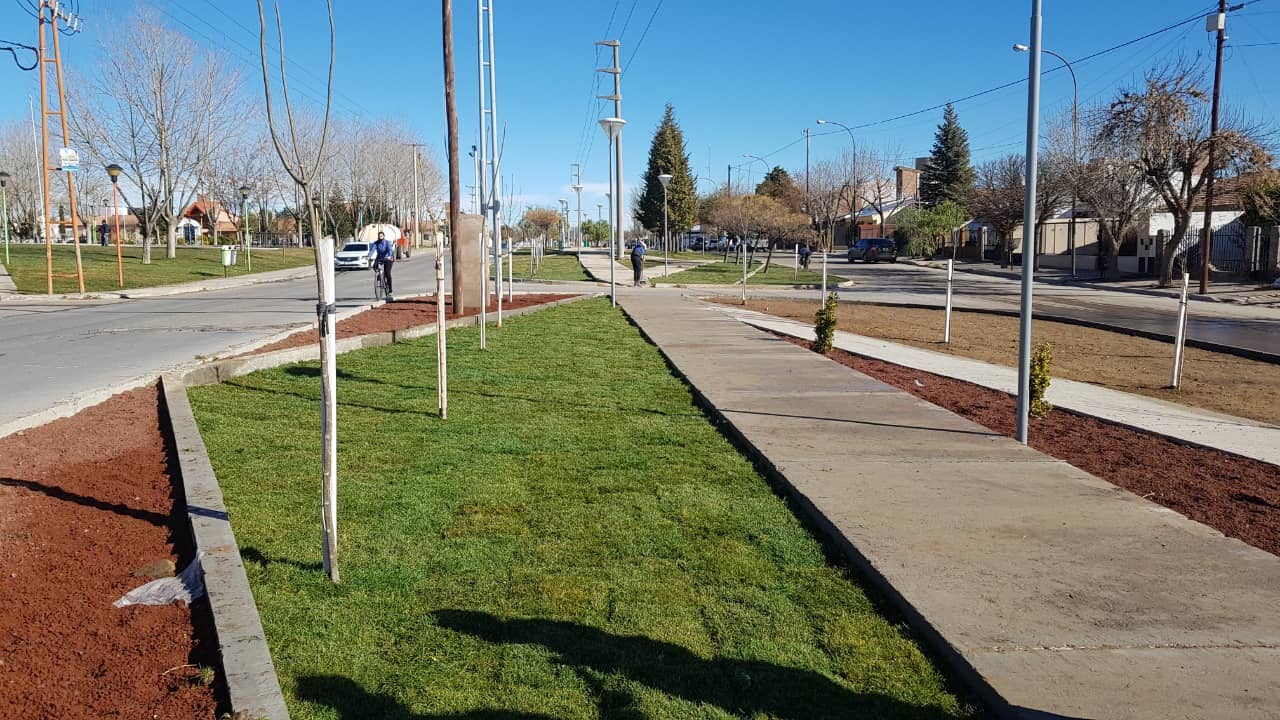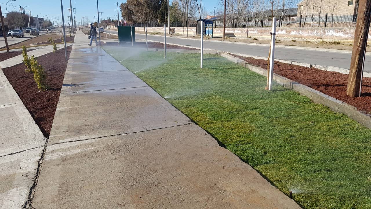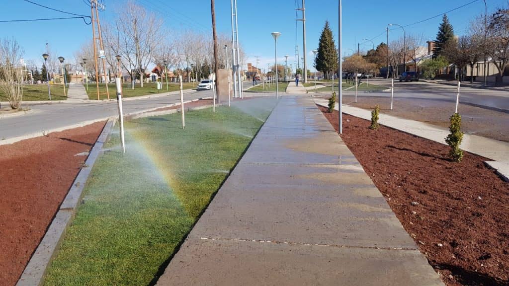 La obra de parquización y automatización del bulevar sobre la avenida Los Cipreses que limita los barrios 25 de Mayo y Pueblo Nuevo, en Cutral Co.
