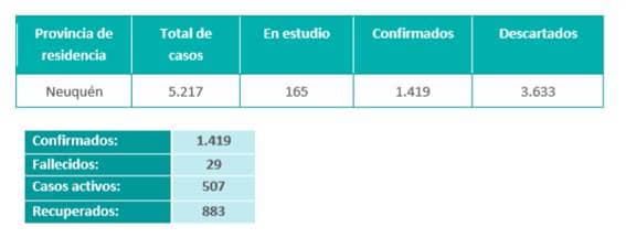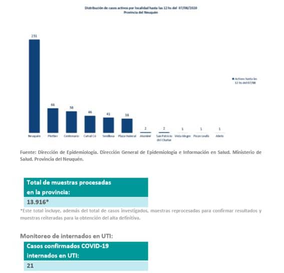 Y además se anunció una fe de errata: un caso confirmado de Covid-19 de Centenario fue informado dos veces. Es decir que se resta uno al total de casos confirmados y en el gráfico de localidades.