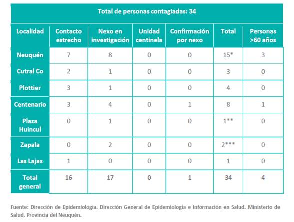 El primer comunicado del Comité de Emergencia Provincial de este martes, reporta 34 nuevas personas contagiadas de Coronavirus (COVID-19) de la provincia del Neuquén. Tres corresponden a Cutral Co y 1 a Plaza Huincul que es trabajador de salud.