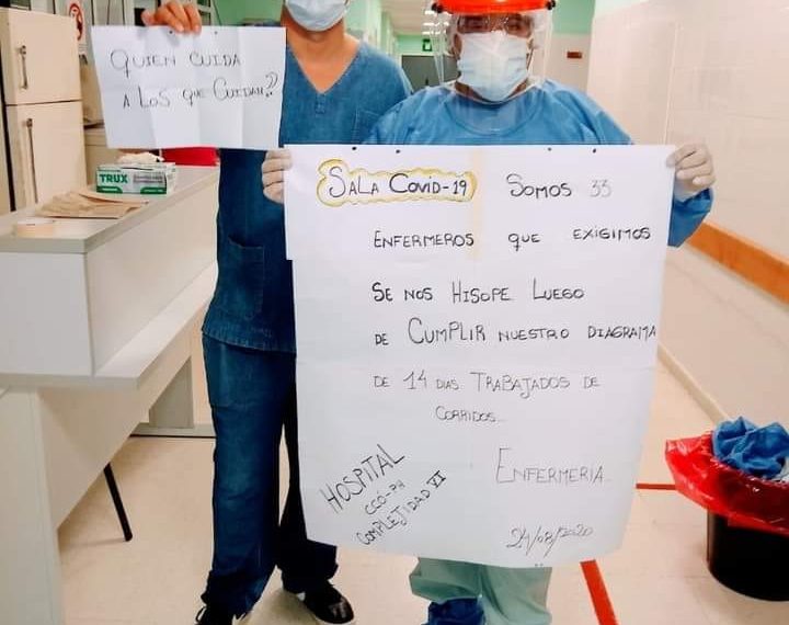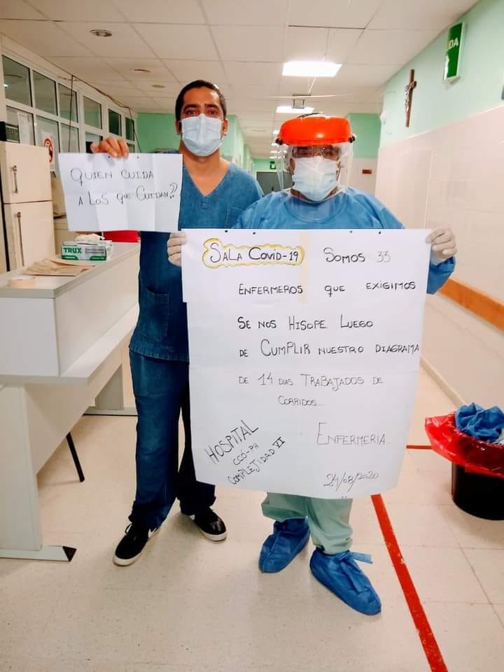 “Estamos trabajando 14 días seguidos con la sala en un 90% de ocupación, pacientes en respirador y no nos hisopan. Podemos ser COVID-19 positivos asintomaticos y estar trabajando poniendo en riesgo nuestra salud, ya que estamos altamente expuestos” señala una publicación de Facebook acompañada por el reclamo que los enfermeros plasmaron en un afiche.