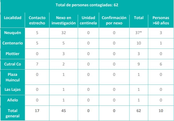 El último parte de la noche de este viernes da cuenta 9 casos en Cutral Co y uno en Plaza Huincul. En la provincia, son 62 los confirmados este último parte.
