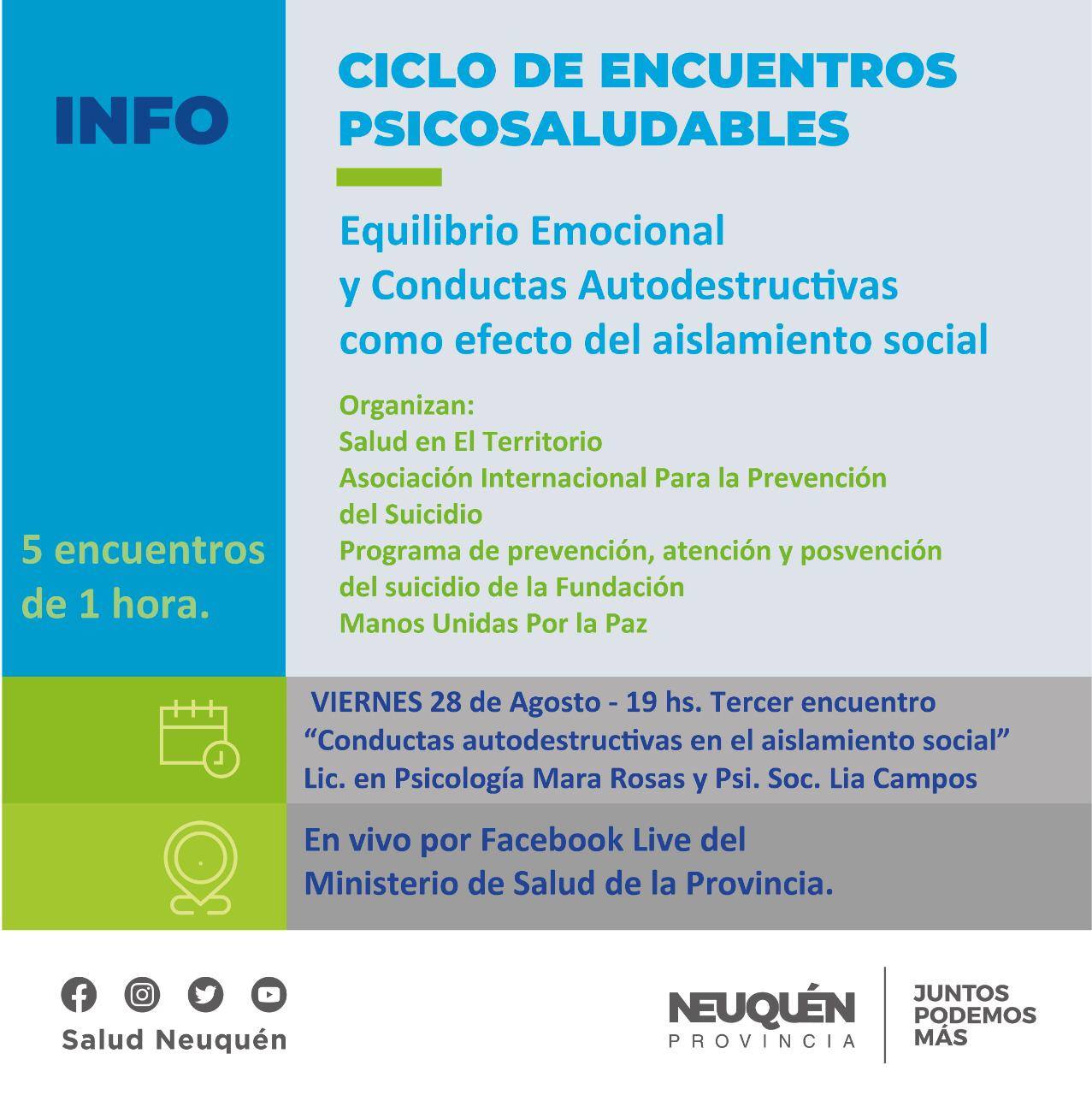 La temática de esta oportunidad será “Conductas autodestructivas en el aislamiento social”, y estará a cargo de la licenciada en Psicología, Mara Rosas y la psicóloga Social Lía Campos, integrantes de la Mesa Intersectorial de Trabajo (M.T.I) de Plaza Huincul.
