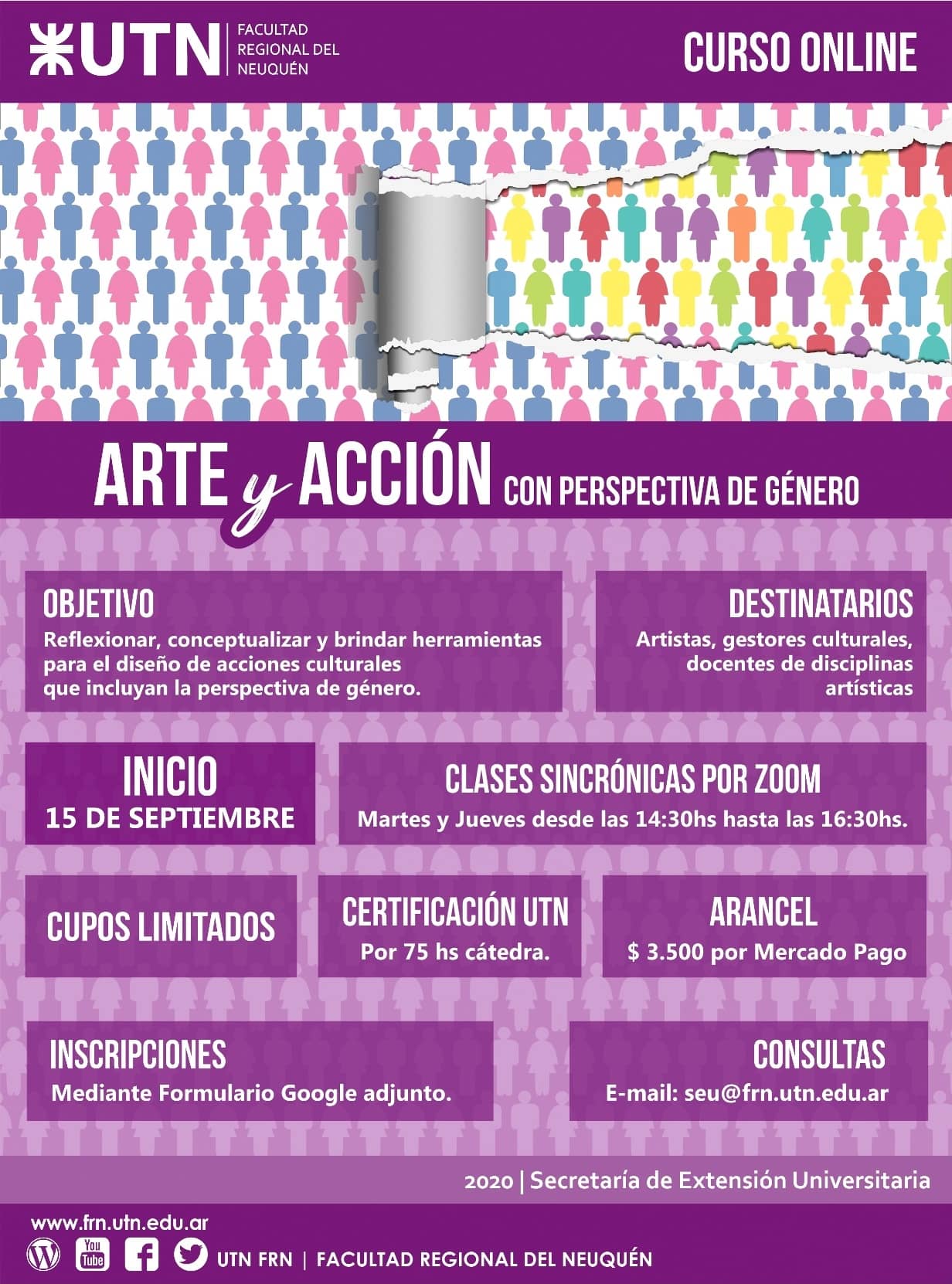 Las consultas pueden hacerse mediante correo electrónico: seu@frn.utn.edu.ar – Secretaría de Extensión Universitaria de UTN Facultad Regional del Neuquén, con asiento en Plaza Huincul.