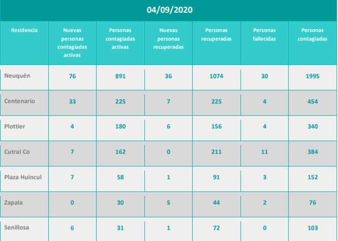 Además, se reportaron cincuenta y siete (57) nuevas personas recuperadas de Coronavirus (COVID-19) de la provincia del Neuquén: 36 personas de Neuquén capital, 7 personas de Centenario, 6 personas de Plottier, 5 personas de Zapala, 1 persona de Senillosa, 1 persona de Plaza Huincul y 1 persona de Las Lajas. Se trata de 22 mujeres y 35 varones, cuyas edades oscilan entre los 4 y los 76 años.