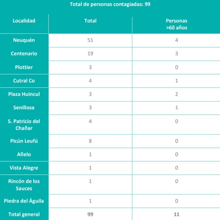 En la provincia, en la noche se reportaron noventa y nueve (99) nuevas personas contagiadas de Coronavirus (COVID-19) de la provincia del Neuquén.