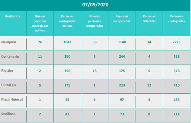 Además, se reportaron sesenta y tres (63) nuevas personas recuperadas de Coronavirus (COVID-19) de la provincia del Neuquén: 33 personas de Neuquén capital, 13 personas de Plottier, 6 personas de Centenario, 3 personas de Chos Malal, 3 personas de Las Ovejas, 2 personas de Zapala, 1 persona de Cutral Co, 1 persona de Plaza Huincul y 1 persona de Senillosa. Se trata de 34 varones y 29 mujeres, cuyas edades oscilan entre los 4 y 83 años.