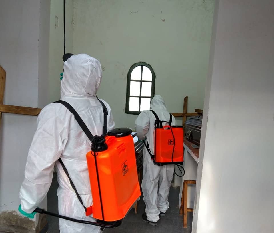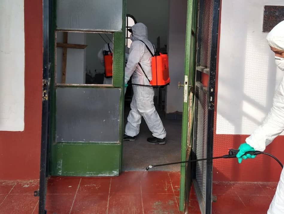El personal, que pertenece a la secretaría de Obras y Servicios Públicos indicó que se concretó la tarea de desinfección de las oficinas, en la capilla y el predio de acceso a la necrópolis local. Se hizo especial hincapié en pulverizar los espacios comunes.