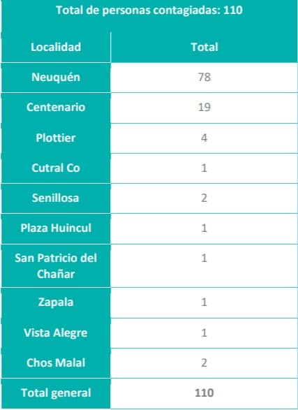 Uno de ellos se reporta de Cutral Co y el otro de Plaza Huincul. Mientras que en la provincia, se notificaron ciento diez (110) nuevas personas contagiadas de Coronavirus (COVID-19) de la provincia del Neuquén