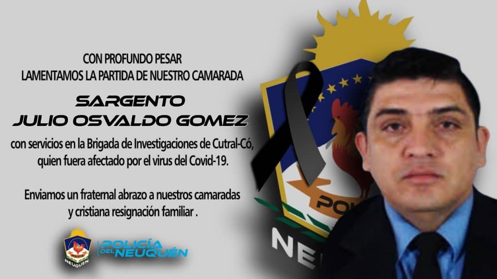 La Policía del Neuquén comunica con profundo pesar, que en el día de hoy (21-09) falleció quien en vida fuera el SARGENTO JULIO OSVALDO GOMEZ, con servicios en la División Brigada de Investigaciones dependiente de la Dirección Seguridad Interior Cutral Co.