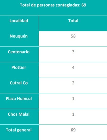 El total reportado es de sesenta y nueve (69) nuevas personas contagiadas de Coronavirus (COVID-19) de la provincia del Neuquén.