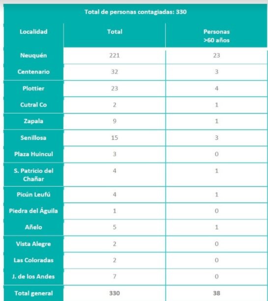 Además, se reportaron trescientas nueve (309) nuevas personas recuperadas de Coronavirus (COVID-19) de la provincia del Neuquén: 225 personas de Neuquén capital, 35 personas de Cutral Co, 19 personas de Plottier, 13 personas de Zapala, 11 personas de Plaza Huincul, 2 personas de Centenario, 2 personas de San Patricio del Chañar, 1 persona de Senillosa y 1 persona de San Martín de los Andes. Se trata de 162 mujeres y 147 varones, cuyas edades oscilan entre 0 y 96 años.