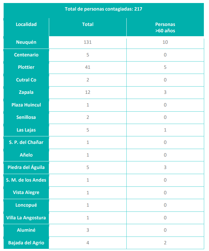 En este ocasión hubo dos casos de Cutral Co y uno de Plaza Huincul. Zapala sumó 12 más y Añelo otro caso. La mayor cantidad de casos se registraron en Neuquen capital con 127 y Plottier con 41 casos.