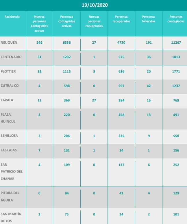Por otra parte, se informó el fallecimiento de diecinueve personas de la provincia del Neuquén por Coronavirus (COVID-19): 13 personas de Neuquén capital, 2 personas de Plottier, 1 persona de San Patricio del Chañar, 1 persona de Zapala, 1 persona de Cutral Co y 1 persona de Plaza Huincul. Se trata de 3 mujeres y 16 varones, cuyas edades oscilan entre 56 y 99 años.