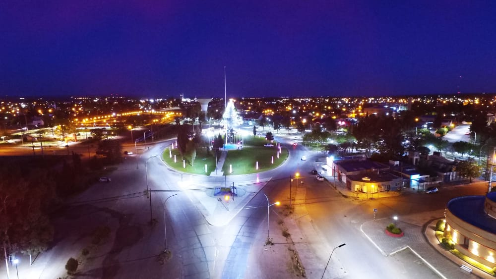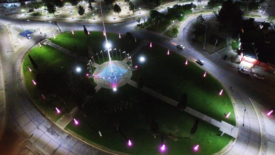 En Plaza Huincul se iluminó la plazoleta de Las Banderas de color rosa