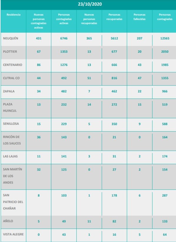 El parte confirmó una persona fallecida de Cutral Co. Los recuperados son: 51 de Cutral Co y 14 de Cutral Co.