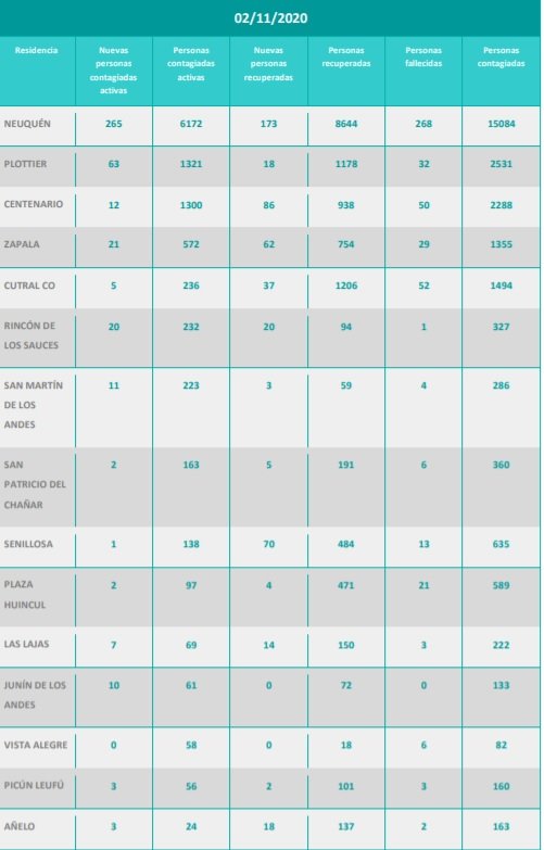 Además, se reportaron quinientas treinta (530) nuevas personas recuperadas de Coronavirus (COVID-19) de la provincia del Neuquén: 173 personas de Neuquén capital, 86 personas de Centenario, 70 personas de Senillosa, 62 personas de Zapala, 37 personas de Cutral Co, 20 personas de Rincón de los Sauces, 18 personas de Añelo, 18 personas de Plottier, 14 personas de Las Lajas, 7 personas de Bajada del Agrio, 5 personas de San Patricio del Chañar, 5 personas de Loncopué, 4 personas de Plaza Huincul, 3 personas de San Martín de los Andes, personas de Mariano Moreno, 2 personas de Picún Leufú, 2 personas de Piedra del Águila, 1 persona de Los Catutos y 1 persona de Aluminé. Se trata de 262 mujeres y 268 varones, cuyas edades oscilan entre 4 meses y 93 años.