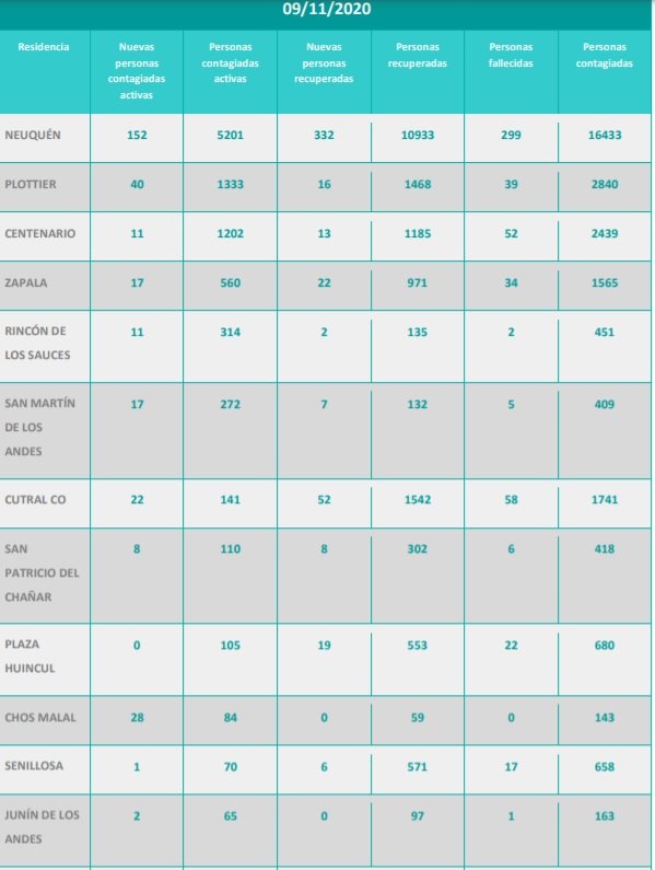 Coronavirus (COVID-19) de la provincia del Neuquén: 332 personas de Neuquén capital, 52