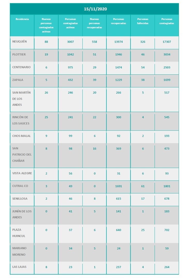 En la provincia hubo diez personas fallecidas por Coronavirus (COVID-19): 2 personas de Neuquén capital, 2 personas de Plottier, 1 persona de Centenario, 1 persona de Zapala, 1 persona de Cutral Co, 1 persona de Plaza Huincul, 1 persona de Rincón de los Sauces y 1 persona de Moquehue. Se trata de 2 mujeres y 8 varones, cuyas edades oscilan entre 41 y 76 años.
