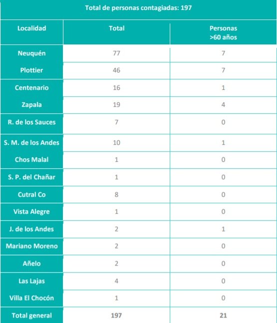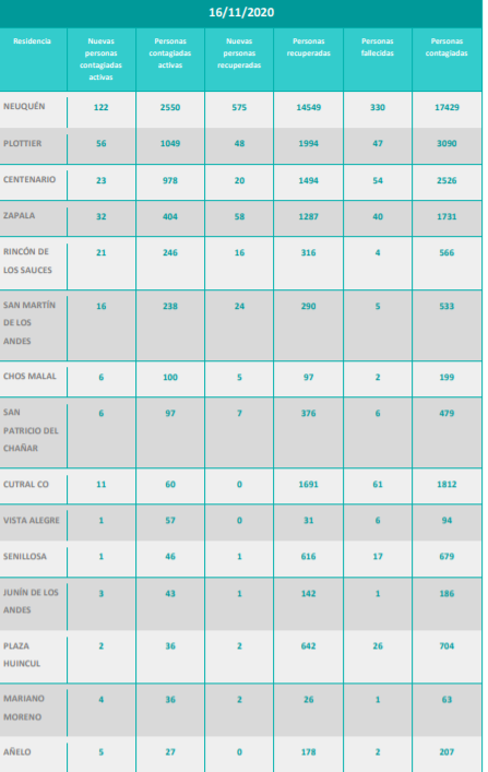 Además, se reportaron setecientas setenta y cuatro (774) nuevas personas recuperadas de Coronavirus (COVID-19) de la provincia del Neuquén: 575 personas de Neuquén capital, 58 personas de Zapala, 48 personas de Plottier, 24 personas de San Martín de los Andes, 20 personas de Centenario, 16 personas de Rincón de los Sauces, 13 personas de Las Lajas, 7 personas de San Patricio del Chañar, 5 personas de Chos Malal, 2 personas de Mariano Moreno, 2 personas de Plaza Huincul, 1 persona de Taquimilán, 1 persona de Villa El Chocón, 1 persona de Senillosa y 1 persona de Junín de los Andes. Se trata de 389 mujeres y 385 varones, cuyas edades oscilan entre 1 y 94 años.