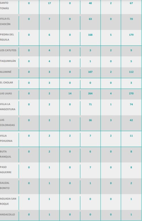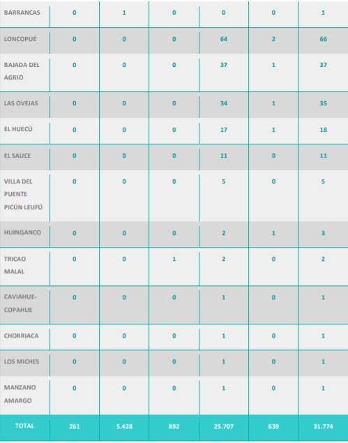 Reclasificación: una persona con resultado positivo para COVID-19 informada previamente con domicilio en Neuquén capital, corresponde a la localidad de Cutral Co. Tres personas con resultado positivo para COVID-19 informada previamente con domicilio en Zapala, corresponde a la localidad de Mariano Moreno. Dos personas con resultado positivo para COVID-19 informada previamente con domicilio en Zapala, corresponde a la localidad de Las Lajas.