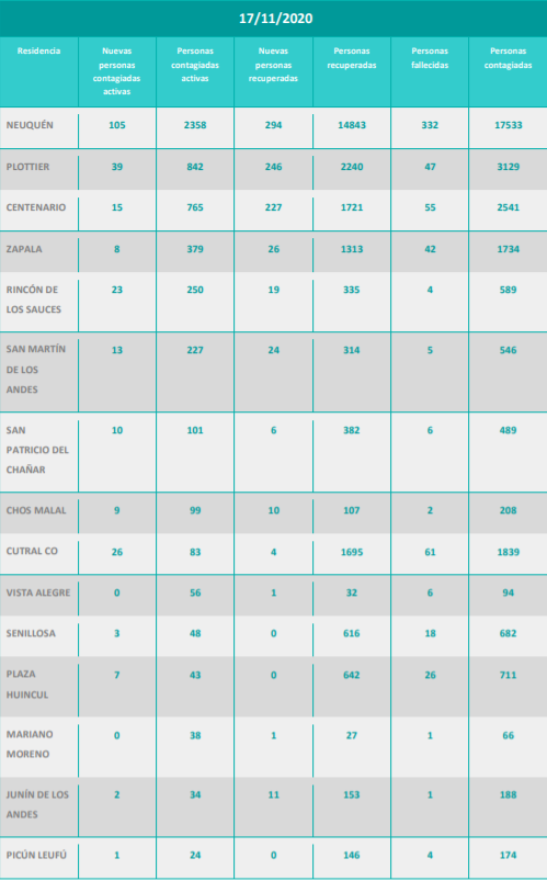 Por otra parte, se informó el fallecimiento de seis personas de la provincia del Neuquén por Coronavirus (COVID-19): 2 personas de Neuquén capital, 2 personas de Zapala, 1 persona de Senillosa y 1 persona de Centenario. Se trata de 4 mujeres y 2 varones, cuyas edades oscilan entre 51 y 87 años.