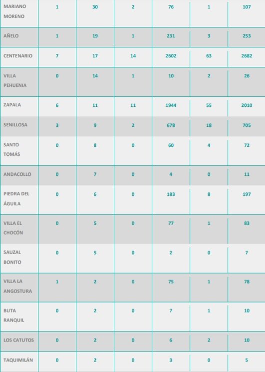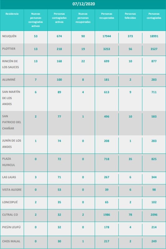 Además, se reportaron ciento setenta y ocho (178) nuevas personas recuperadas de Coronavirus (COVID-19) de la provincia del Neuquén: 90 personas de Neuquén capital, 22 personas de Rincón de los Sauces, 19 personas de Plottier, 14 personas de Centenario, 11 personas de Zapala, 8 personas de Aluminé, 4 personas de San Martín de los Andes, 2 personas de Senillosa, 2 personas de Cutral Co, 2 personas de Mariano Moreno, 1 persona de Añelo, 1 persona de Villa Pehuenia, 1 persona de Chos Malal y 1 persona de San Patricio del Chañar. Se trata de 95 mujeres y 83 varones, cuyas edades oscilan entre 4 meses y 92 años.