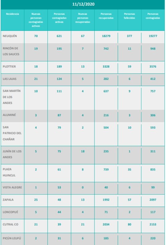 Además, se reportaron doscientas cinco (205) nuevas personas recuperadas de Coronavirus (COVID-19) de la provincia del Neuquén: 67 personas de Neuquén capital, 21 personas de Cutral Co, 19 personas de Chos Malal, 18 personas de Junín de los Andes, 13 personas de Zapala, 13 personas de Plottier, 8 personas de Plaza Huincul, 7 personas de Rincón de los Sauces, 6 personas de Picún Leufú, 5 personas de Las Lajas, 4 personas de San Martín de los Andes, 4 personas de Aluminé, 4 personas de Senillosa, 4 personas de Loncopué, 3 personas de Mariano Moreno, 2 personas de San Patricio del Chañar, 2 personas de Villa Pehuenia, 2 personas de Centenario, 1 persona de El Cholar, 1 persona de Piedra del Águila y 1 persona de Sauzal Bonito. Se trata de 114 mujeres y 91 varones, cuyas edades oscilan entre 6 meses y 87 años.