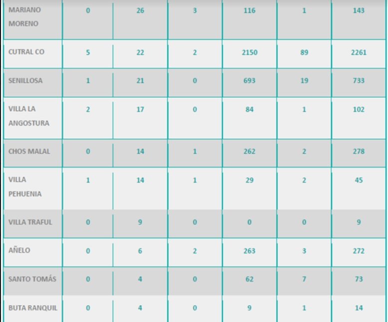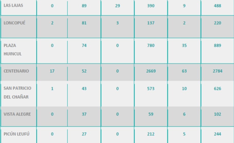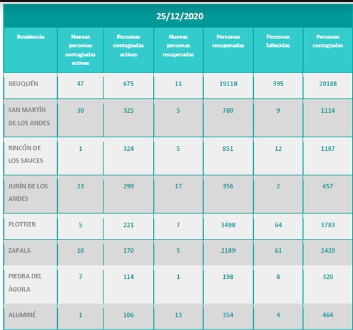 Además, se reportaron 105 nuevas personas recuperadas de coronavirus (COVID-19) de la provincia del Neuquén: 29 personas de Las Lajas, 17 personas de Junín de los Andes, 13 personas de Aluminé, 11 personas de Neuquén capital, 7 personas de Plottier, 5 personas de San Martín de los Andes, 5 personas de Zapala, 5 personas de Rincón de los Sauces 3 personas de Mariano Moreno, 3 personas de Loncopué, dos personas de Añelo, dos personas de Cutral Co, una persona de Villa Pehuenia, una persona de Piedra del Águila y una persona de Chos Malal. Se trata de 51 mujeres y 54 varones, cuyas edades oscilan entre dos y 84 años.