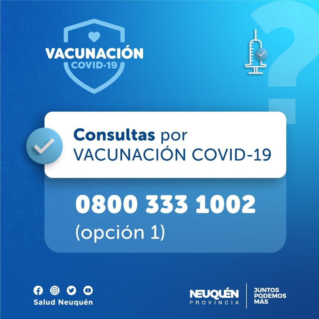 Todas aquellas personas que tengan consultas sobre la campaña de vacunación en Neuquén pueden comunicarse al 0-800-333-1002, opción 1, para evacuar sus dudas.