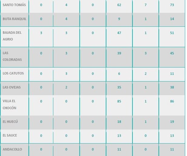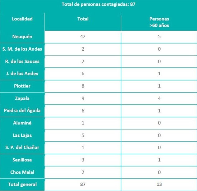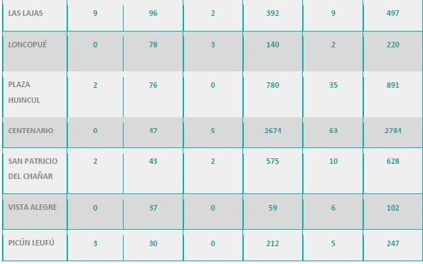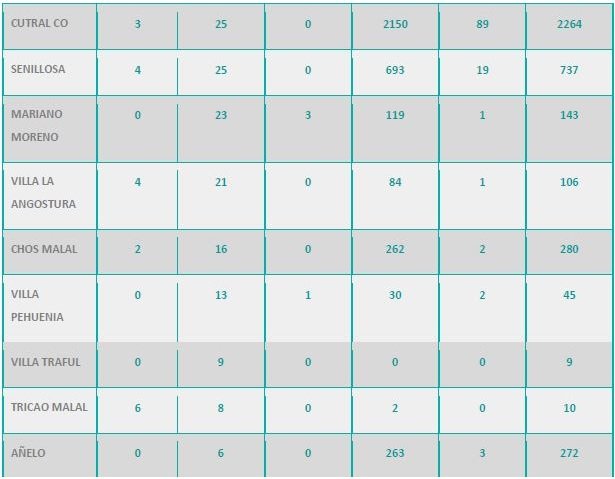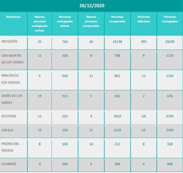 Además, se reportaron 115 nuevas personas recuperadas de coronavirus (COVID-19) de la provincia del Neuquén: 31 personas de Zapala, 20 personas de Neuquén capital, 14 personas de Piedra del Águila, 11 personas de Rincón de los Sauces, 8 personas de San Martín de los Andes, 6 personas de Aluminé, 5 personas de Centenario, 5 personas de Junín de los Andes, 4 personas de Plottier, 3 personas de Loncopué, 3 personas de Mariano Moreno, 2 personas de Las Lajas, 2 personas de San Patricio del Chañar y 1 persona de Villa Pehuenia. Se trata de 53 mujeres y 62 varones, cuyas edades oscilan entre 1 y 84 años.