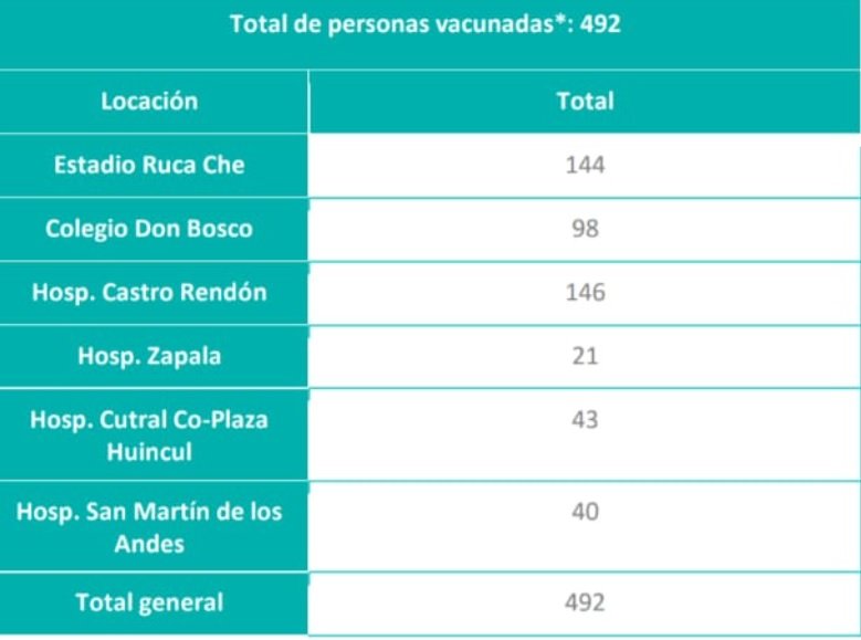 En la provincia, la totalidad de las personas inoculadas son 492. El operativo fue de manera simultánea en Neuquén, Zapala y San Martín de los Andes además de la comarca petrolera. En total, a la provincia llegaron 1.800 dosis. Hoy también se aplicaron la vacuna el gobernador Omar Gutiérrez y la ministra de Salud, Andrea Peve.