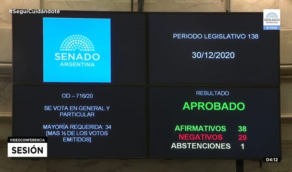 Tras 12 horas de debate, el Senado convirtió en ley el proyecto de Interrupción Voluntaria del Embarazo (IVE) con 38 votos positivos, 29 en contra y una abstención (cuatro ausencias).