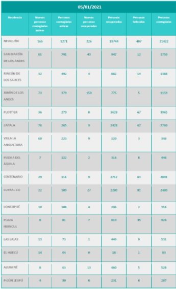 Además, se reportaron quinientas treinta y dos (532) nuevas personas recuperadas de Coronavirus (COVID-19) de la provincia del Neuquén: 226 personas de Neuquén capital, 150 personas de Junín de los Andes, 43 personas de San Martín de los Andes, 27 personas de Cutral Co, 13 personas de Aluminé, 9 personas de Centenario, 9 personas de Villa La Angostura, 9 personas de Zapala, 8 personas de Plottier, 7 personas de Plaza Huincul, 6 personas de Picún Leufú, 4 personas de Rincón de los Sauces, 4 personas de Senillosa, 4 personas de Loncopué, 3 personas de Chos Malal, 2 personas de Buta Ranquil, 2 personas de Piedra del Águila, 2 personas de San Patricio del Chañar, 1 persona de Añelo, 1 persona de Bajada del Agrio, 1 persona de Las Lajas y 1 persona de Mariano Moreno. Se trata de 271 mujeres y 261 varones, cuyas edades oscilan entre 8 meses y 95 años.