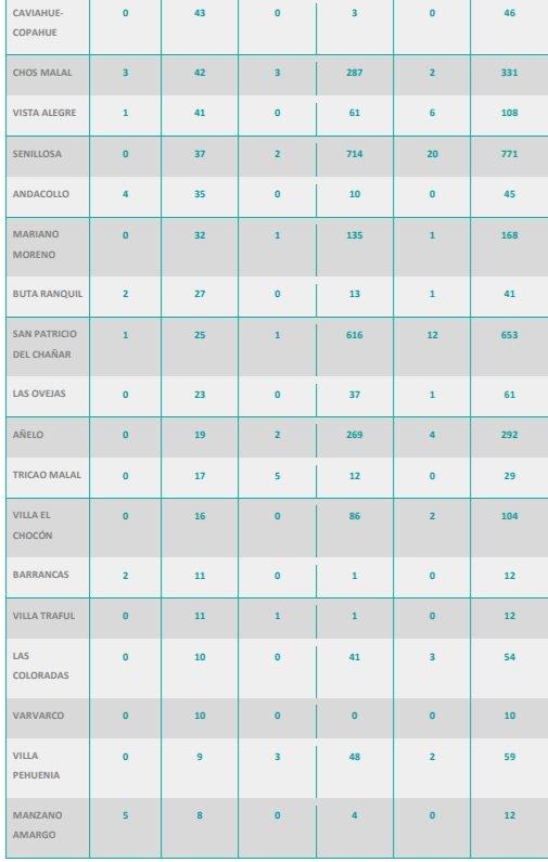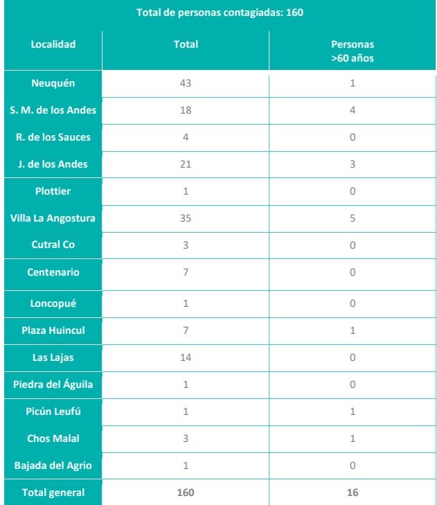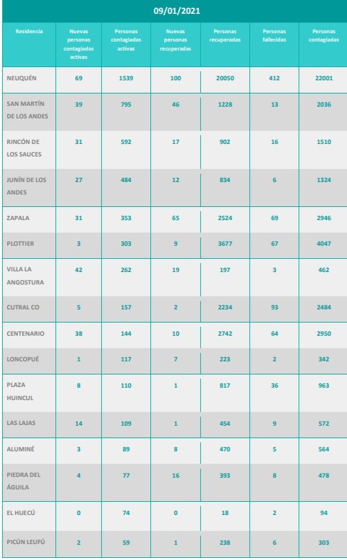 Las personas fallecidas de la provincia son: 3 personas de Neuquén capital, 1 persona de Zapala y 1 persona de Rincón de los Sauces. Se trata de 2 mujeres y 3 varones, cuyas edades oscilan entre 61 y 76 años.